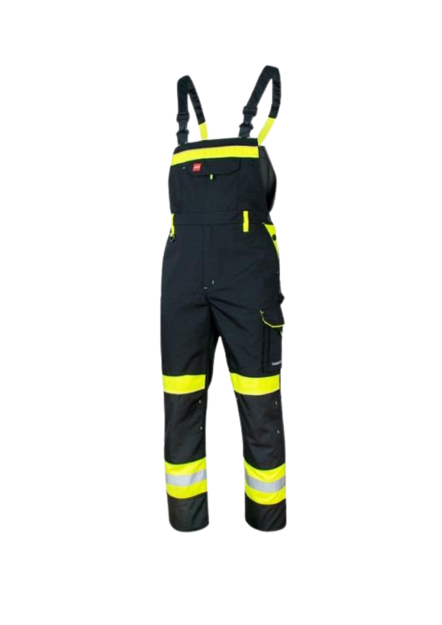 Ypač tvirtas ir atsparus dėvėjimuisi drobinio pynimo (CANVAS) puskombinezonis darbui su šviesą atspindinčiomis detalėmis. Ryškiaspalvio geltono audinio elementai skirti geresniam matomumui užtikrinti. Kelnių keliai pastiprinti dviguba medžiagos kloste, galimybė įkišti antkelius. Petnešų ilgis reguliuojamas, pritaikant rūbą patogesniam naudojimui. Juosmens srityje – kilpos diržui. Sagomis ir elastine guma reguliuojama juosmens apimtis. Daug patogių lipdukais užsegamų daugiafunkcinių kišenių priekyje, šonuose ir nugaros srityje.